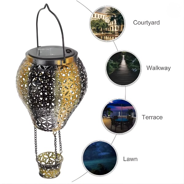 Transforma tus espacios exteriores con el Farol Solar Cálido Globo Aerostático. Este elegante farol, diseñado para iluminar tus noches, combina funcionalidad y estética, creando un ambiente acogedor en jardines, terrazas o patios. Su estructura de metal garantiza durabilidad, mientras que su diseño aerostático añade un toque de originalidad a cualquier entorno.