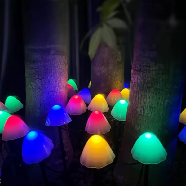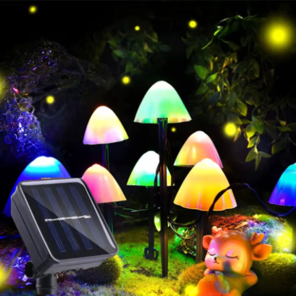 Ilumina tus espacios exteriores con las Luces Solares de 8 hongos multicolor. Diseñadas para embellecer jardines, patios y terrazas, estas luces LED ofrecen un espectáculo de colores vibrantes que transformará cualquier ambiente en un lugar acogedor y festivo. Su diseño en cadena permite una fácil colocación, adaptándose a diversas configuraciones y estilos.